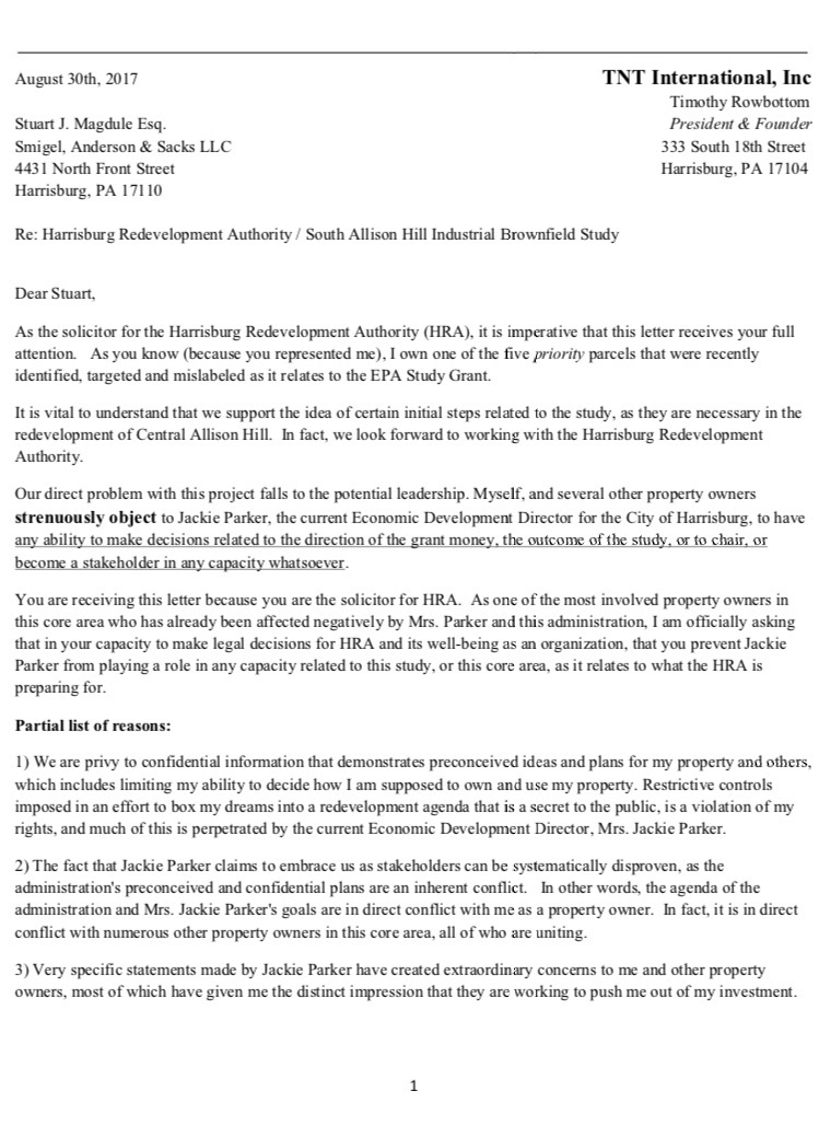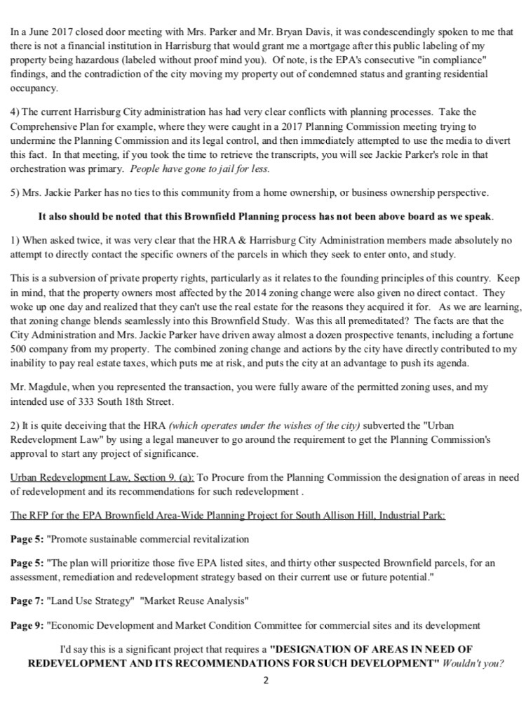 Photo credit: CBS21 NewsIn a letter sent to Harrisburg Redevelopment Authority solicitor Stu Magdule, a Harrisburg resident presents the solid case against the illegal processes. It is detailed how Harrisburg City coordinated a subversion of private property rights and ownership, by using the Brownfield planning fund.