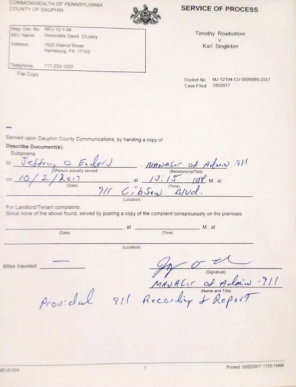 When Rowbottom attempted to serve the Harrisburg Police department today, he was told “No” they can’t accept the supoena.
