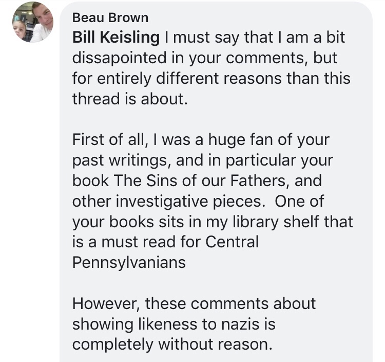 Beau Brown, another upstanding Harrisburg citizen with impressive professional and personal accolades, also reply’s to Mindlin’s post and at first pays homage to the previous published works of Keisling, then explains his disagreement with Keisling’s tasteless and careless anti-semitic comments.
