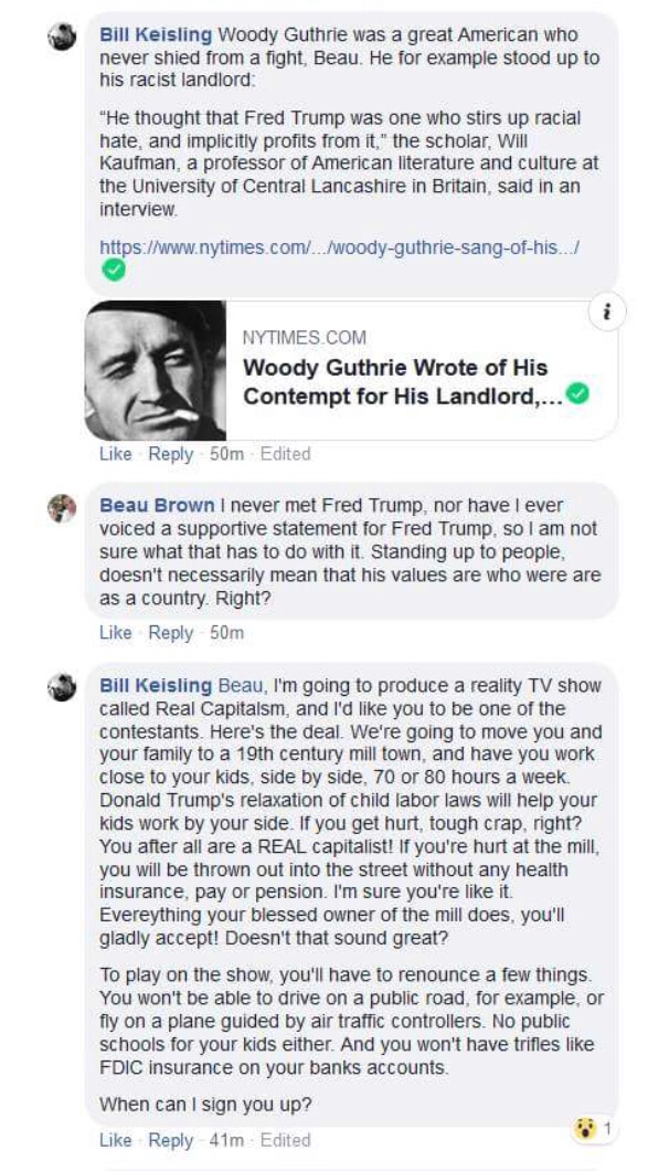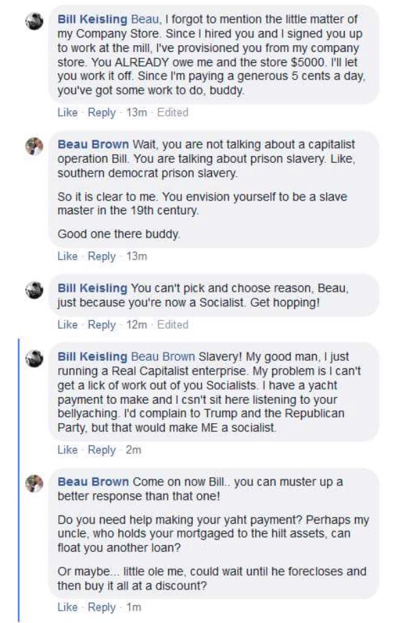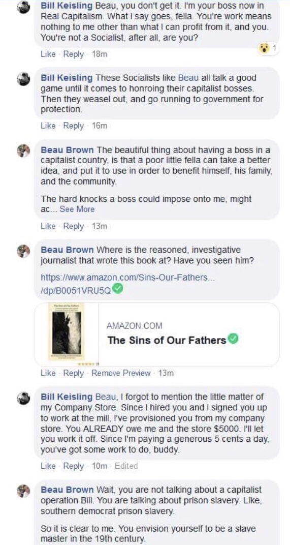 Keisling espouses extreme socialist rhetoric and in a hypothetical scenario he suggests a game show, where he identifies as a capitalist southern slave master in attempt to bait Brown into submitting to the socialist/communist ideology.