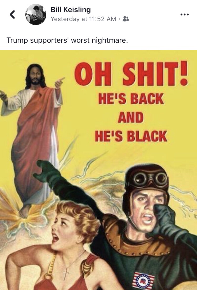 Keisling’s social media postings also express his personal opinions, sometimes backed up by supporting references. However, recently he has entered a dark realm in spreading hatred, racism, and attacks on religion, and has now resorted to a simple internet memes style expression of hate.