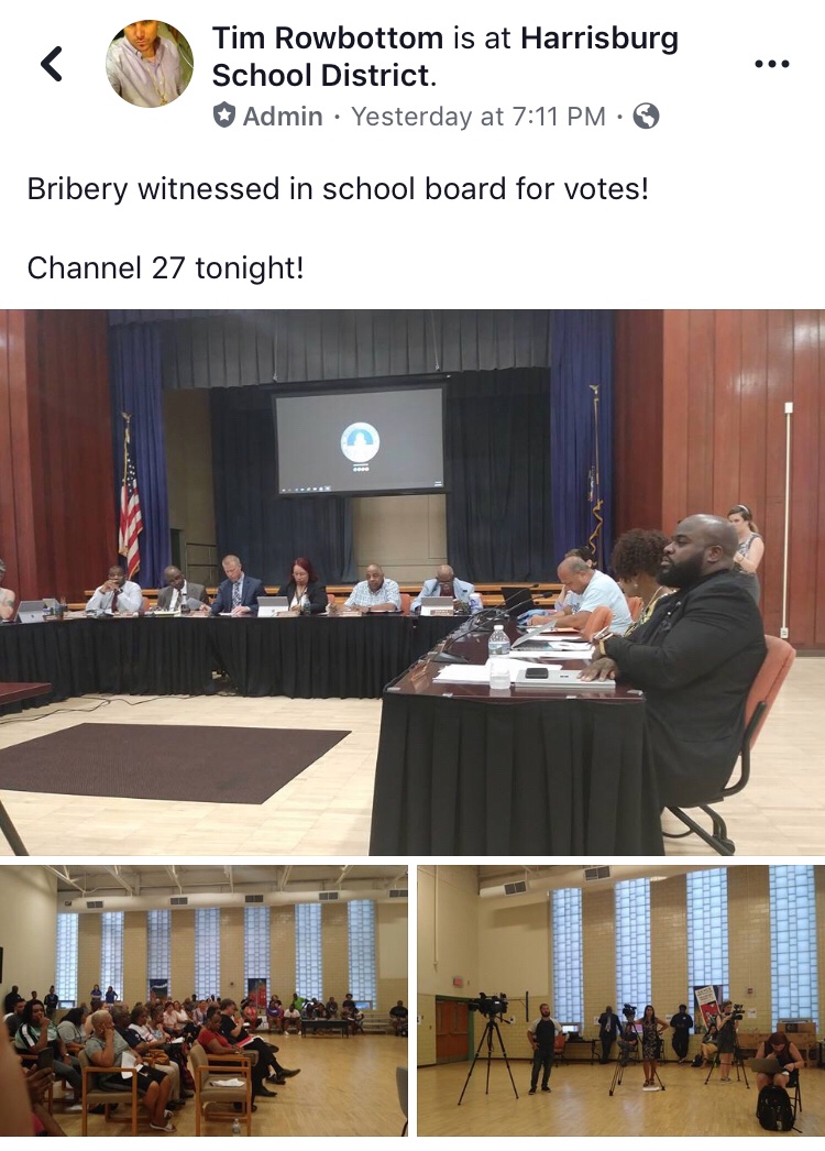Harrisburg, PA – Bribery and coercion where alleged at Monday nights school board meeting in Harrisburg. In response to allegations of board collusion in selecting Lola Lawson over more qualified and publicly preferred candidates, School Board Director Brian Carter admitted that shady deals were also made in the selection of Patricia Whitehead-Myers, and that “there were several conversations among board members trying to bribe other board members to vote for certain people.”