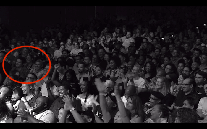 Cooper’s face is clearly visible in the crowd, and two other celebrities appear to be sitting in the same row: singer John Mayer and gay Bravo host Andy Cohen. The pair look to be seated next to each other at the left edge of the screen.