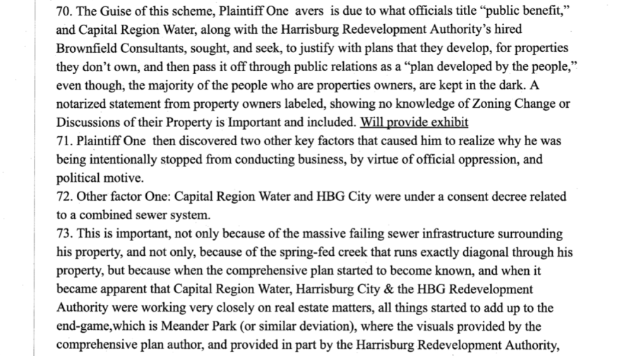 The lawsuit also implicates city and county officials who made strategic zoning changes as a tool to devalue select real estate parcels, and used other public departments to target private property owners. Harrisburg Redevelopment Authority coordinated much of this activity.