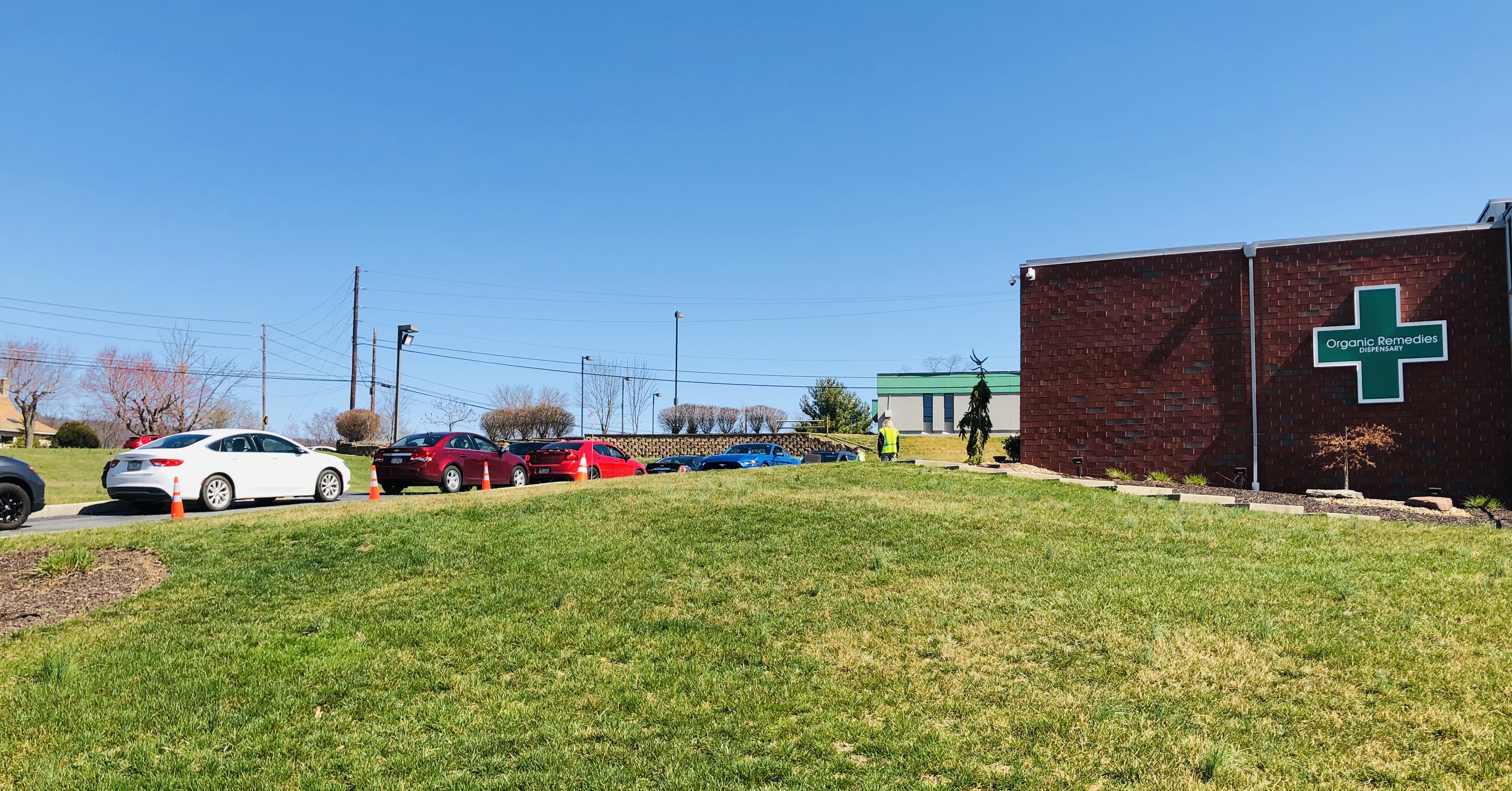 Enola, Pennsylvania – A line of vehicles wrapped around the block at Organic Remedies just before 1 p.m. this afternoon. This location near Interstate 81 is one of the medical marijuana dispensaries that remain open during the coronavirus pandemic to serve the state’s more than 147,000 registered patients.
