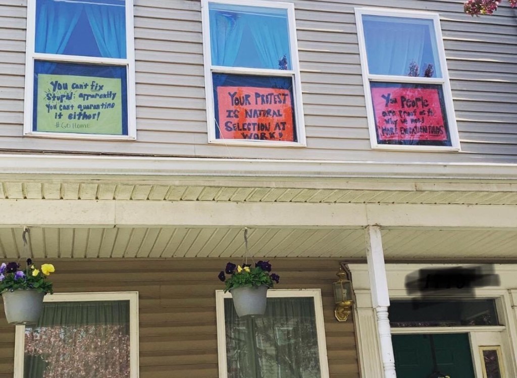 A counter-protester posted a photograph of their home on N. 3rd St. in Midtown with signs hanging in the second story windows saying “you can’t fix stupid,” and calling the protest “natural selection at work.”