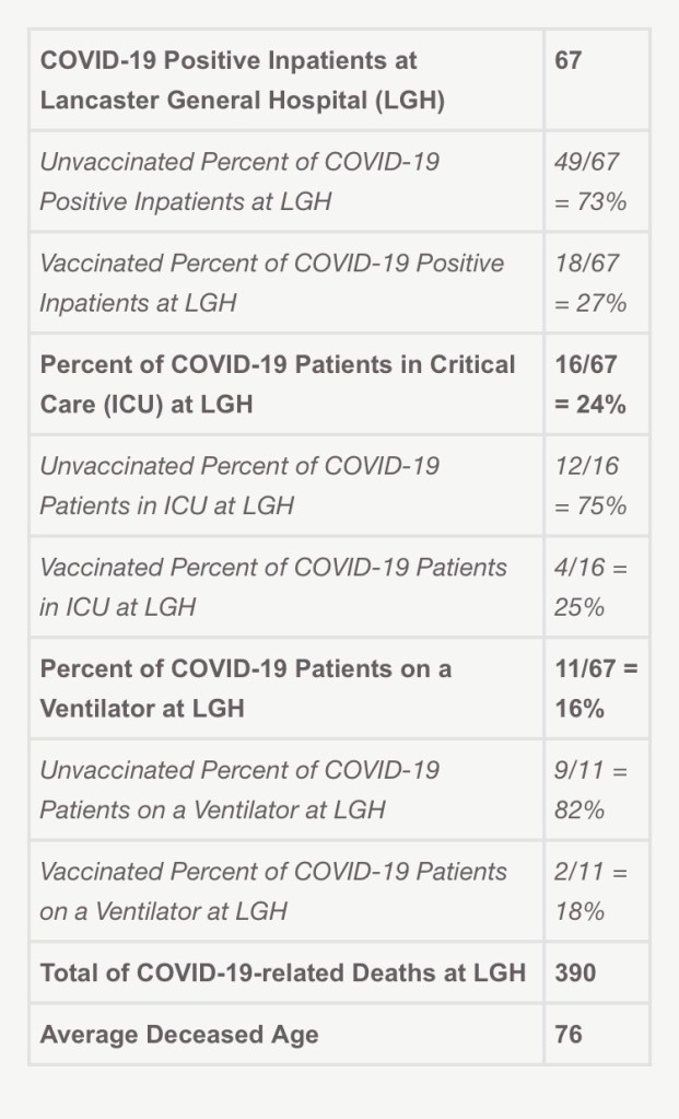 LANCASTER, Pa. – “Breakthrough” cases now make up more than a quarter of hospitalizations at Penn Medicine Lancaster General Hospital, per their Covid dashboard, which was recently updated to reflect “breakthrough” data. Their Covid “breakthrough” patients also make up a quarter of the ICU admissions.