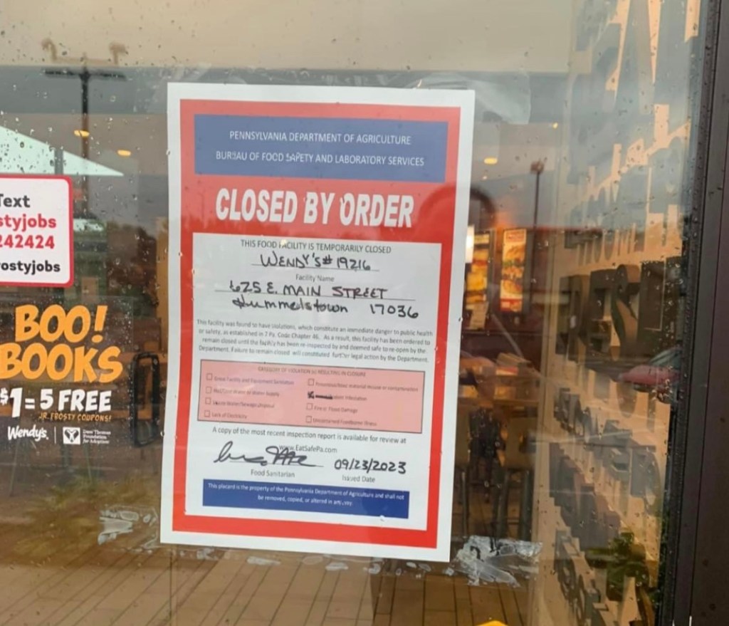 Hummelstown, Pennsylvania – According to a notice posted today on the front door of Wendy’s on Hersheypark Drive in Hummelstown, the building is temporarily closed for business due to a rodent infestation.