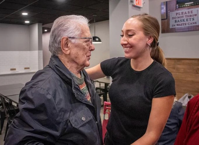 Roger Gaspari, the former owner of Rendezvous Steak Shop, left, gets a hug from his grandniece Zoe Kaminski, one of the owners of the new Rendezvous Pizzeria & Steak Shop 243 W. King St., in Lancaster city Friday, Dec. 1, 2023.