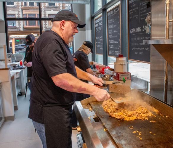 Bob Walsh, Jim Kline, and Chris Chump of the High Construction crew at the Landis Place on King project during the soft opening of the new Rendezvous Stake Shop. Now occupying the first floor of the Landis Place on King building, the iconic Rendezvous Pizzeria & Steak Shop was a staple of downtown Lancaster for decades.