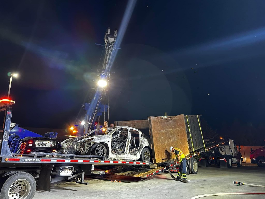 Team 200 (Cumberland County HazMat) was called in to help with spill/run off control. The towing process was initiated, and crews remained on scene to assist in the possible reignition of the fire.