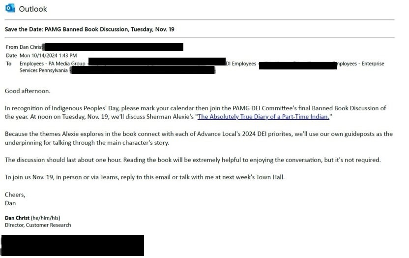 In the email, PA Media Group employees are invited to recognize “Indigenous Peoples” Day, by joining the last “banned book” discussion of the year. The email was sent by Dan Christ, the Director of Customer Research at Advance Local Media, PA Media Group’s parent company.