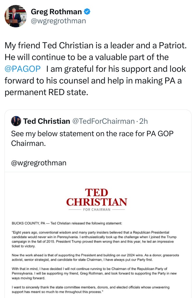 Rothman retweeted Christian’s announcement today on X, and made a statement looking forward to future accomplishments of the Pennsylvania GOP.