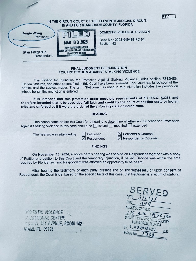 Miami, Florida – March 4, 2025 – After a years-long ordeal, Angie Wong has won a decisive legal victory, securing a permanent Stalking Violence injunction against federal felon Stan Fitzgerald, his aliases, and third-party instigators. The ruling, delivered yesterday in the Eleventh Judicial Circuit Court of Miami-Dade County, Florida, marks a turning point in a harrowing case of online harassment, defamation, and malicious deception.