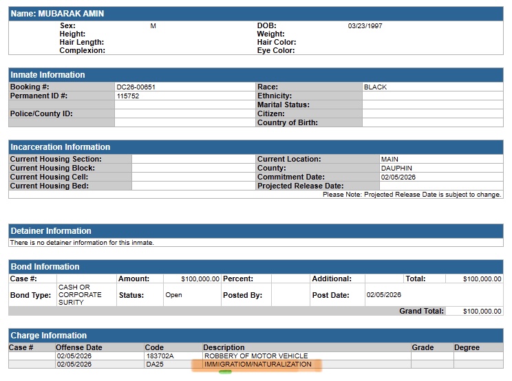 He was transported to Dauphin County Prison, and bail was set at $100,000. Court documents indicate that an ICE detainer was issued on February 5.